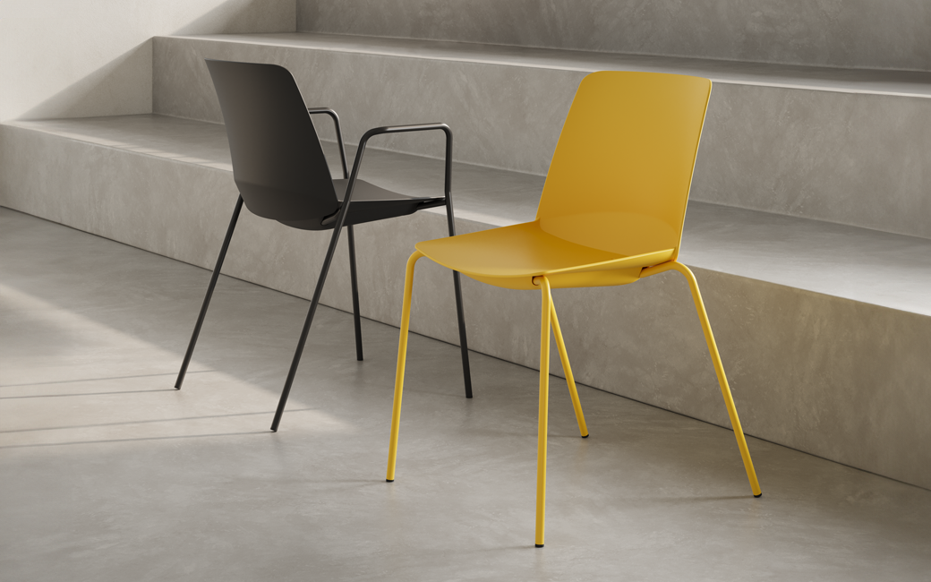 Gemma's technopolymer monoshell chairs are offered in combination with a wide range of frames: 4-legs with and without armrests, sled, swivel and trestle on castors, giving the seats great dynamism in any context of use. The monoshell, characterized by an aesthetic solution that makes the seat and the backrest perceived as separate elements, are available in black, ivory, gray, yellow, red and green. The frames also repropose the same colors, with the addition of a chrome finish. Several accessories are available, including an upholsterable seat panel, and a provision for installing a seat board.