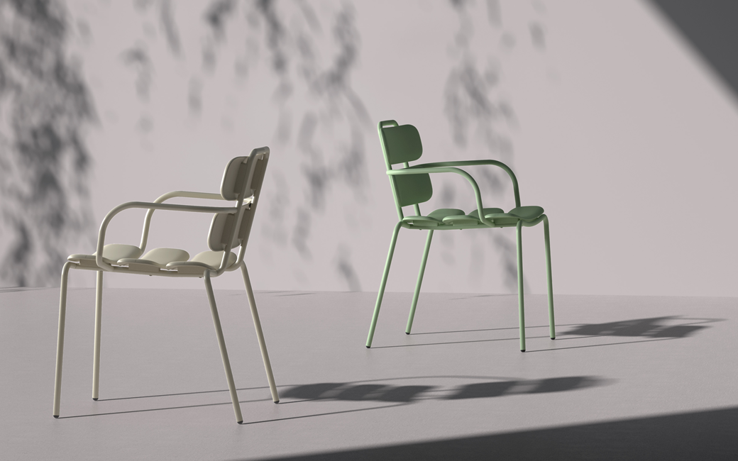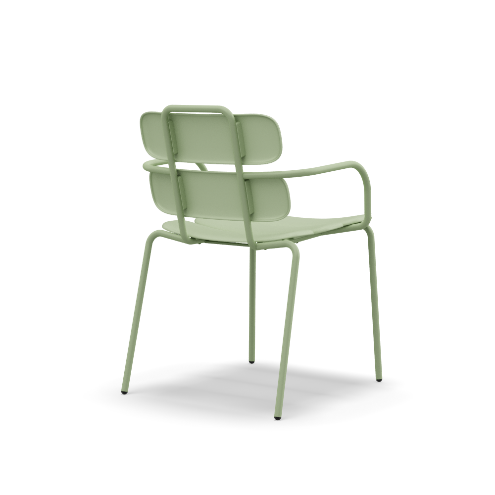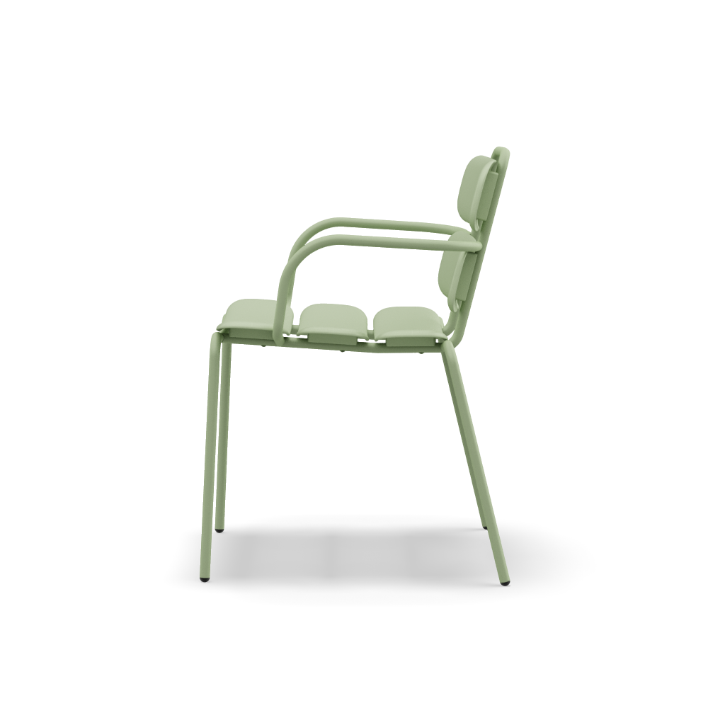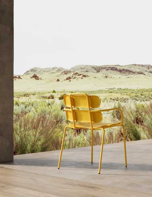 The Lemon chair is ideal for outdoor use. Its distinctive technopolymer staved design makes it a distinctive and practical piece of furniture that is also suitable for indoor settings. The frame has no visible screws and is available in either a version with armrests or without, both of which are stackable. Lemon is offered in a curated selection of 6 colors: black, ivory, gray, yellow, red, and green.