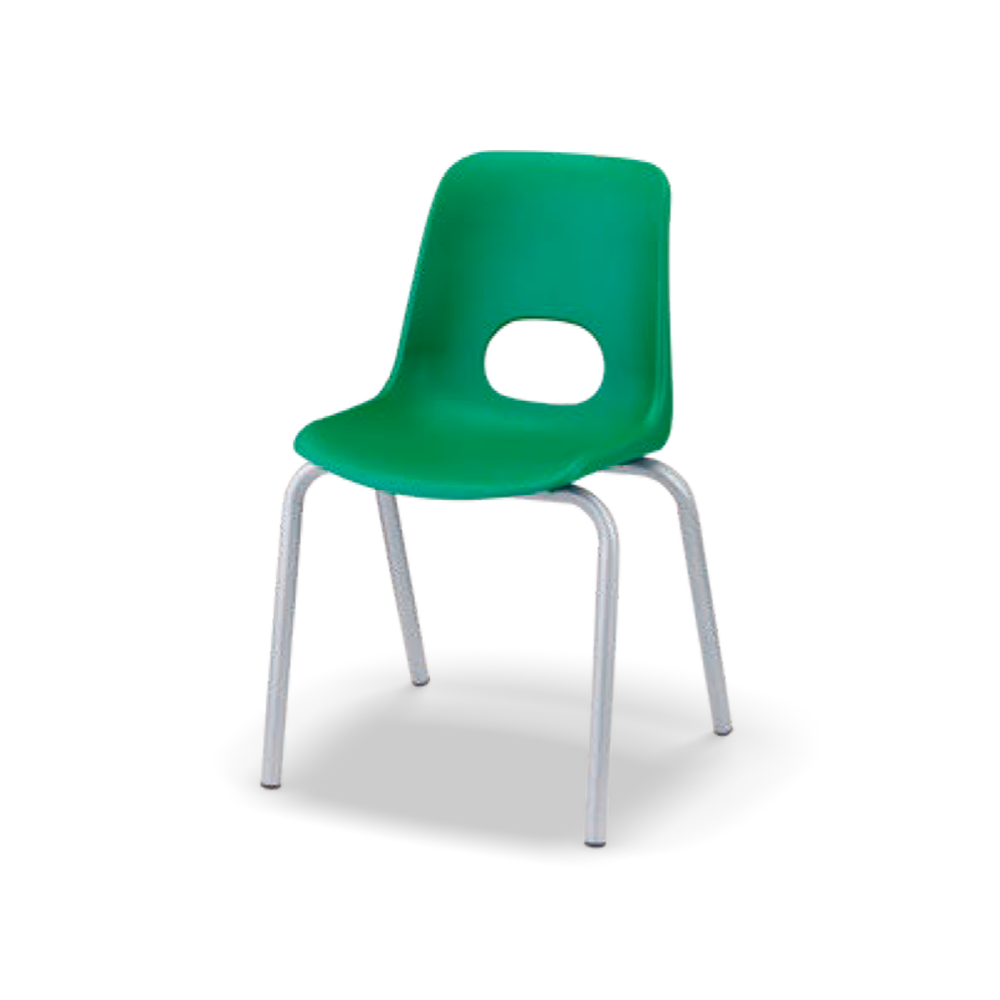 A plastic monoshell chair dedicated to educational settings, available with 4-leg and cantilever frames in 4 size variations, which can be combined with monoshells in 2 different sizes. The frames are offered in black, gray and chrome, while the monoshell features a selection of vibrant colors: red, yellow, blue, green.