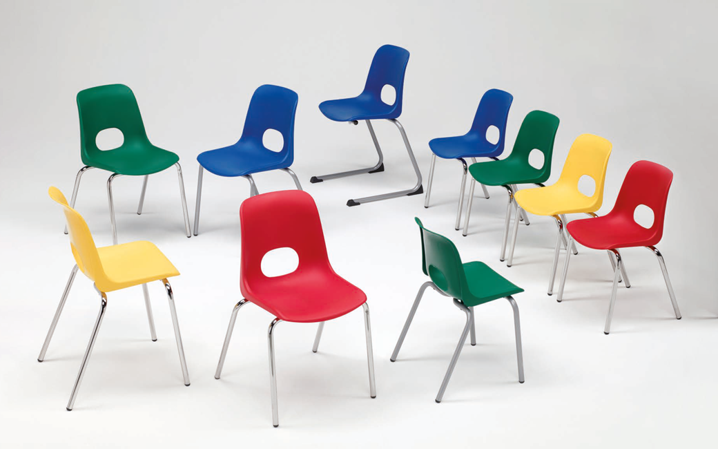 A plastic monoshell chair dedicated to educational settings, available with 4-leg and cantilever frames in 4 size variations, which can be combined with monoshells in 2 different sizes. The frames are offered in black, gray and chrome, while the monoshell features a selection of vibrant colors: red, yellow, blue, green.