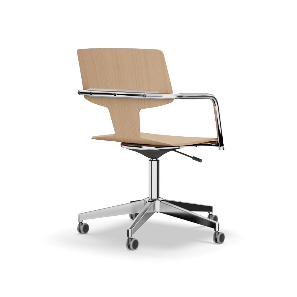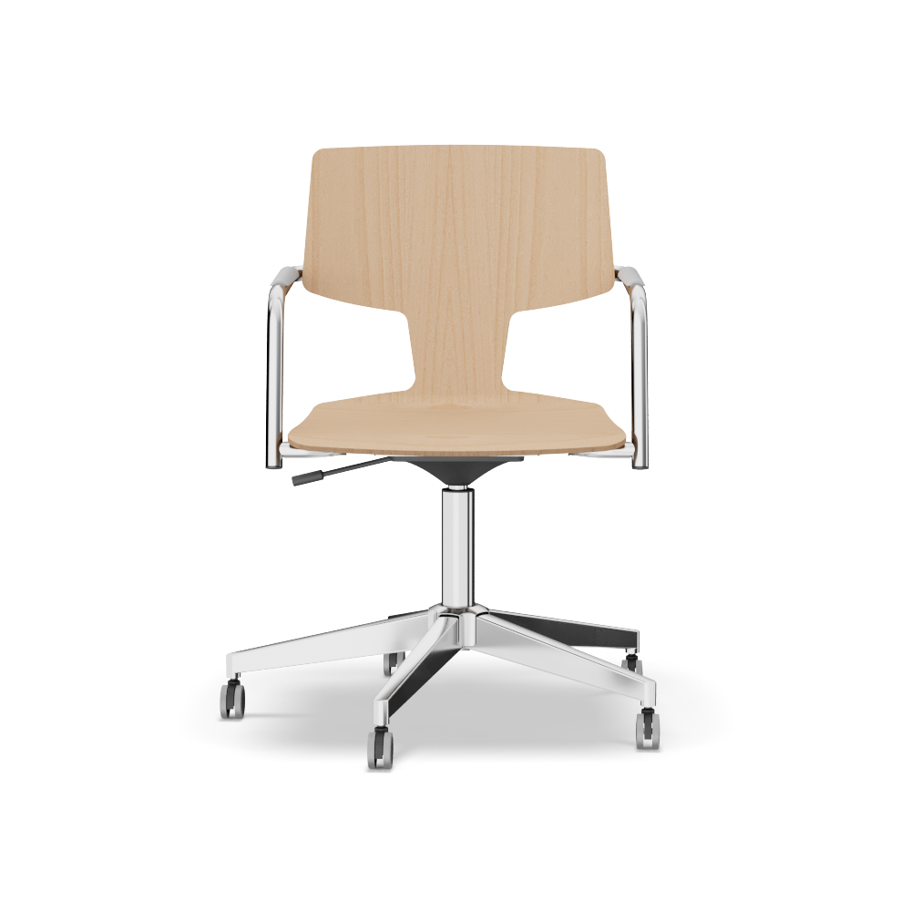 The distinctive shaped lines of the wooden monoshell make Key a chair with a dynamic and fresh design. Matchable with 4-leg and cantilever frames, and swivel bases, the beech monoshell is available in 5 colors: bleached, orange, green, light blue and blue. The frames, on the other hand, are offered in black and gray, and in a chrome finish.
