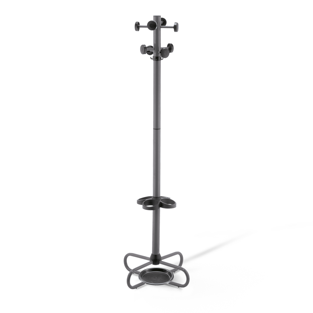 A column coat hanger with a sleek and functional structure, featuring a modern and practical design suitable for a variety of situations. The metal parts are available in black and gray, while the plastic components, such as the umbrella stand, are offered in an elegant black finish.