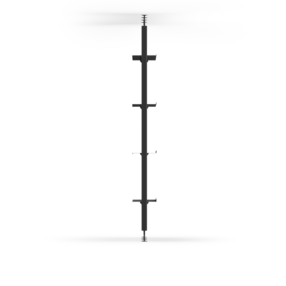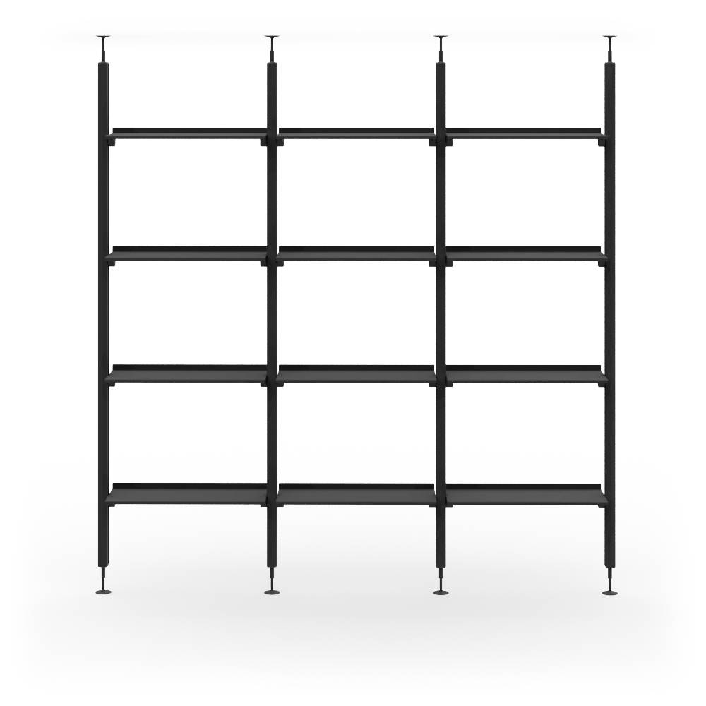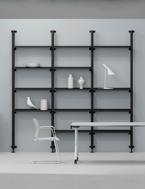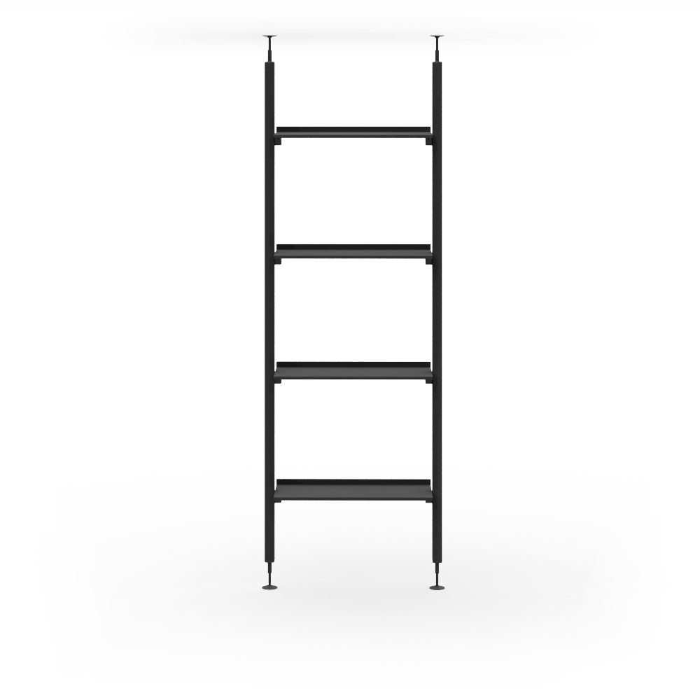 In the ceiling-mounted version, Modula is offered with a height-adjustable upright through the use of special feet, available in 3 different lengths. The modularity provided by the use of side uprights and center uprights allows Modula to be configured in a versatile and dynamic way. The shelf supports, developed by Alba, can be positioned freely along the uprights to ensure total freedom in the arrangement and inclination of the shelves, which are easy to install or remove. Modula offers two classic colors for uprights, feet, shelf supports and shelves: white and black.