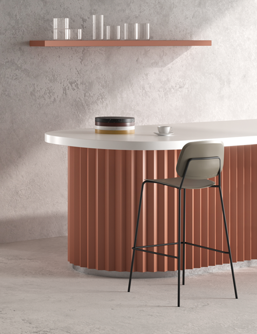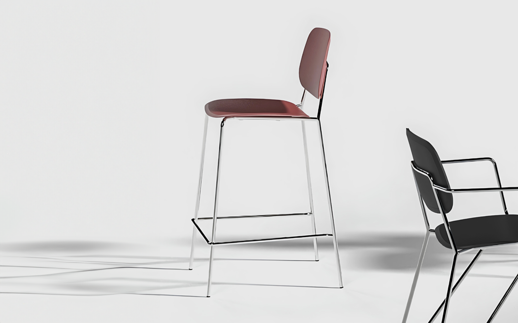The stool version of Jota completes the collection's offerings. The backrest and seat shells sit on a classic and elegant four-leg frame with integrated footrest, available in two heights and 3 colors. The back and seat shells, available in 4 colors and in the natural finish of the Bio-husk material, can be upholstered with any fabric.