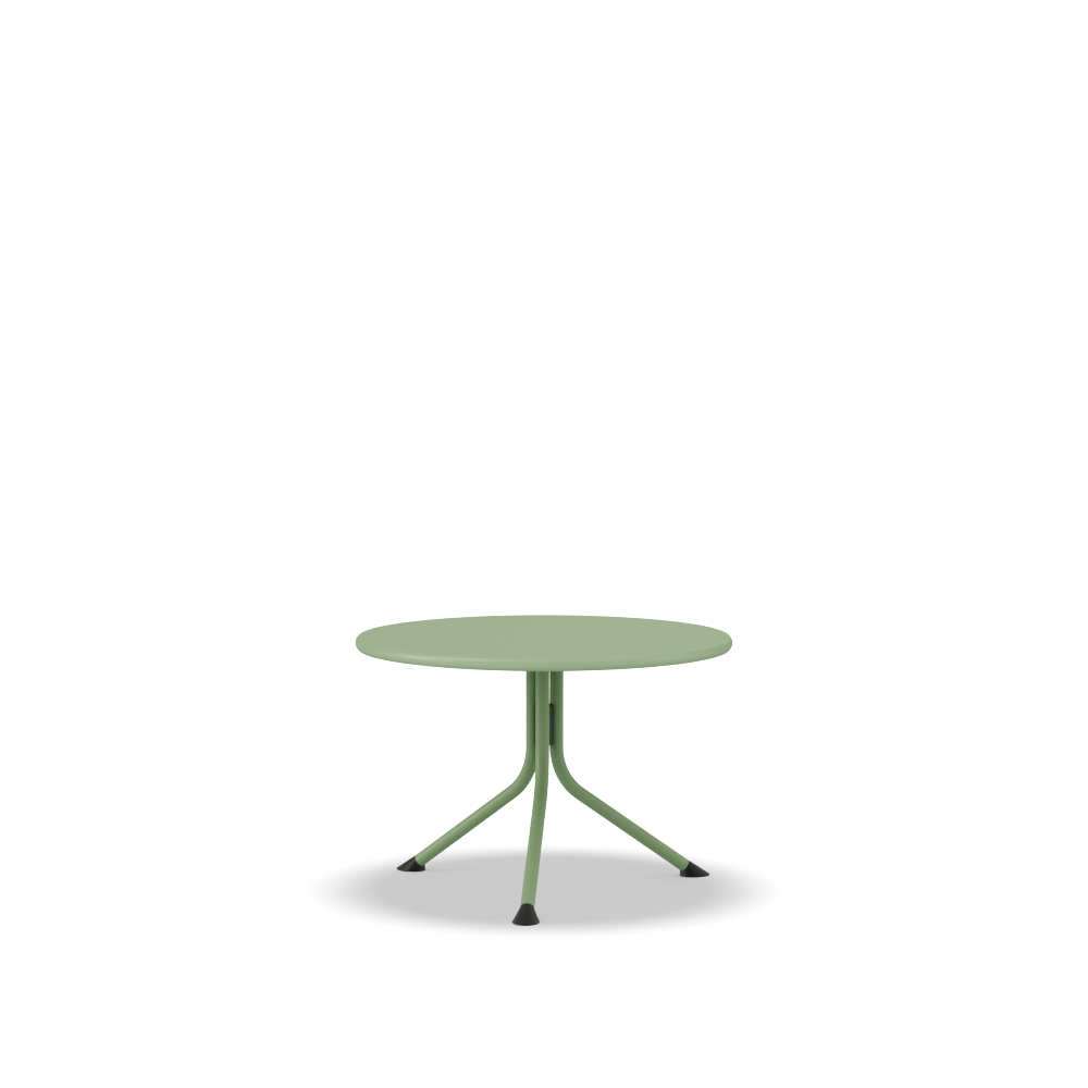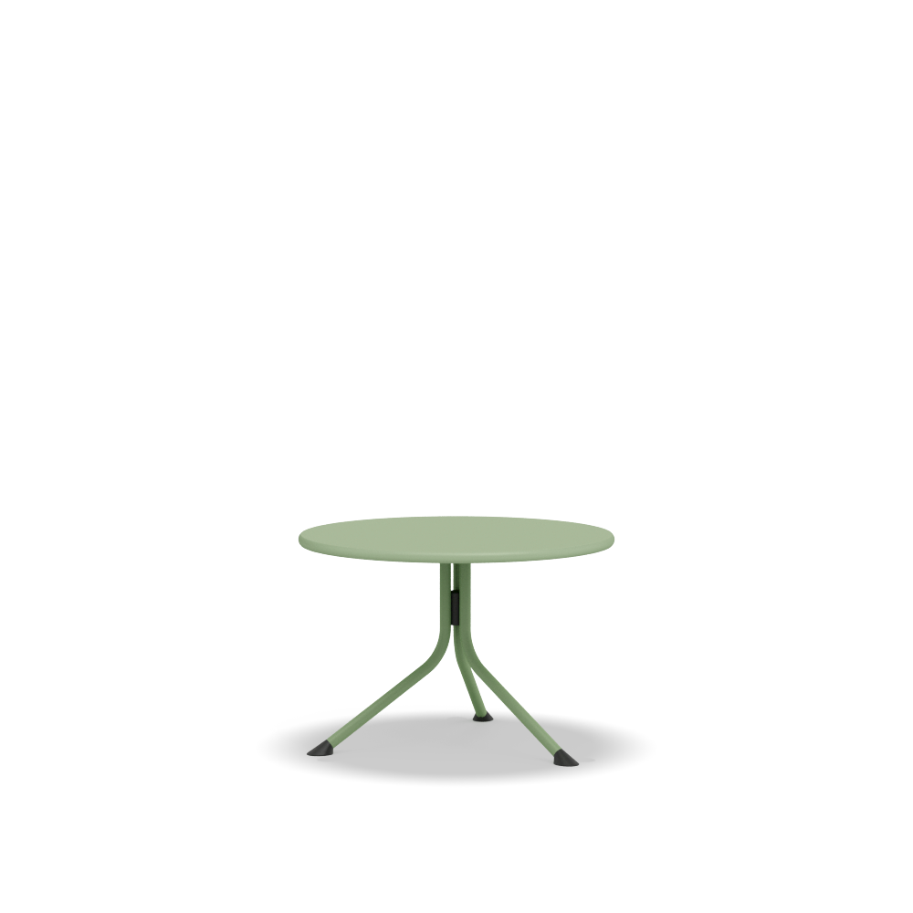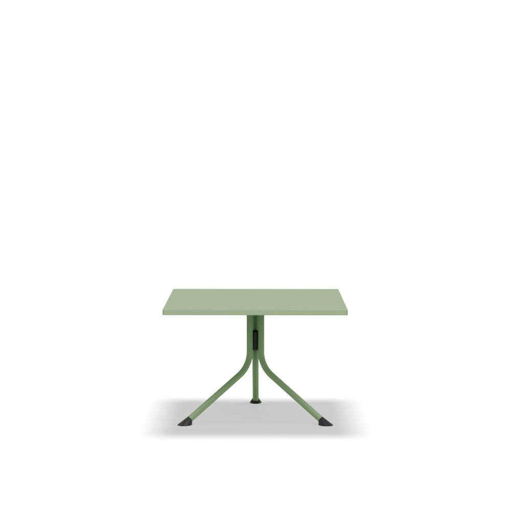 Lemon tables feature a characteristic design with a central base structure consisting of 3 individual legs, with a point of union concealed by a plastic cover featuring essential lines. The low version is ideal for furnishing lounge environments, both in collective and domestic areas, and is offered with square and round tops, in metal or HPL, in 6 different colors, suitable for both outdoor and indoor use.