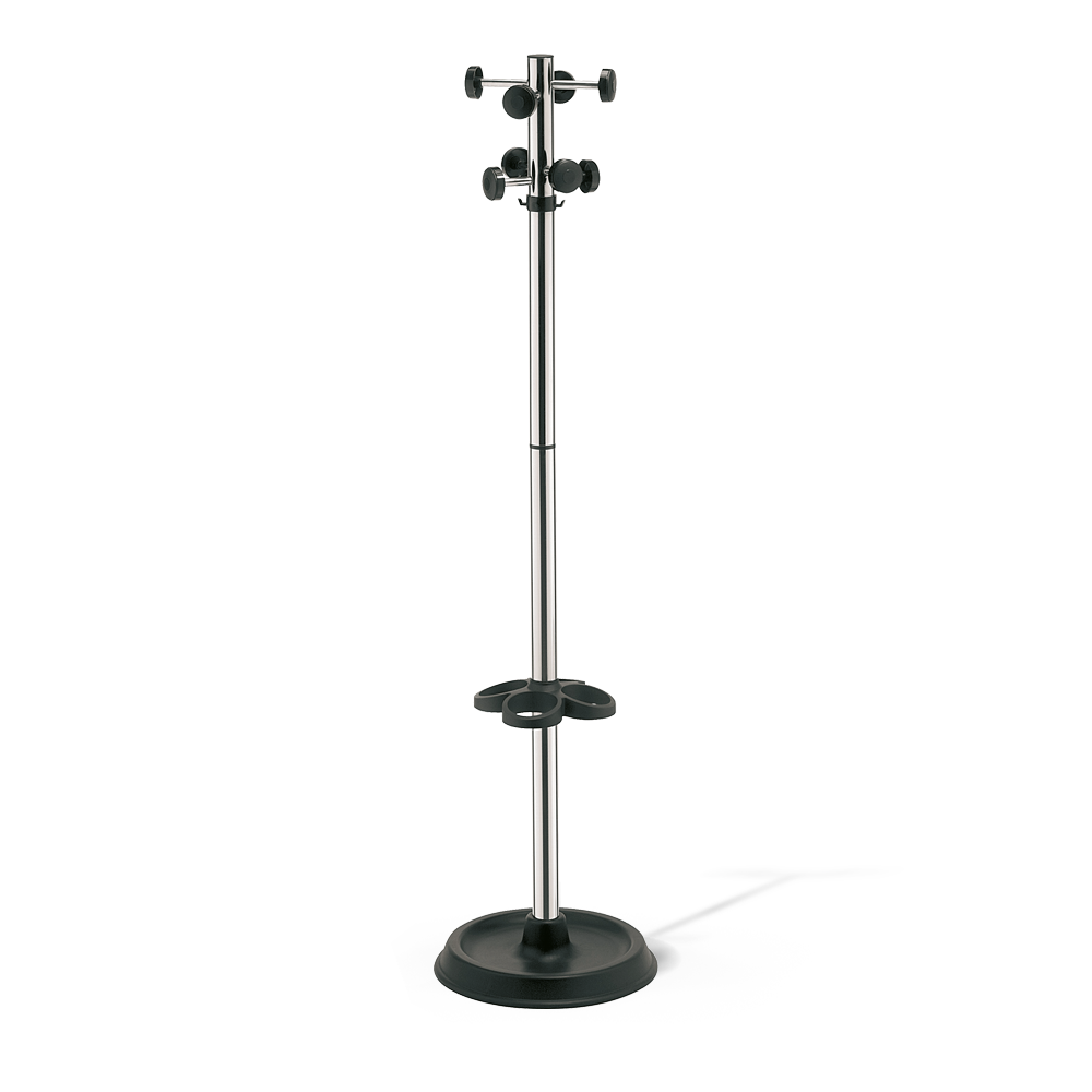 Un appendiabiti a colonna dal design sempre attuale ed efficacie. La struttura a colonna in metallo è disponibile nei colori nero e grigio, e in finitura cromata. I componenti in plastica, tra cui il comodo portaombrelli, sono invece proposti in colore nero.