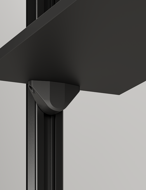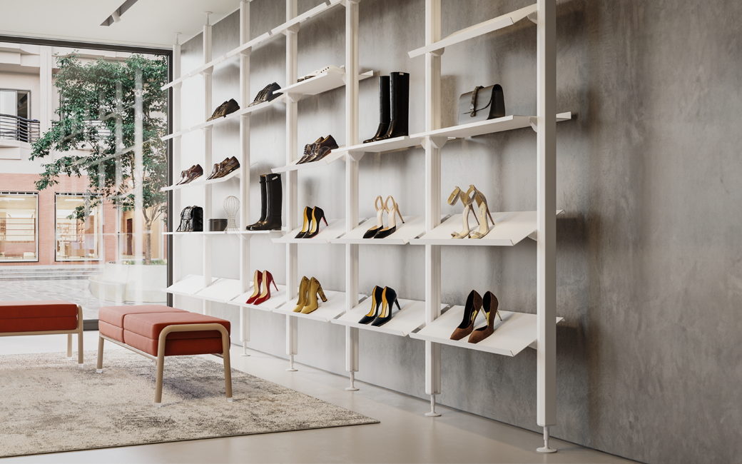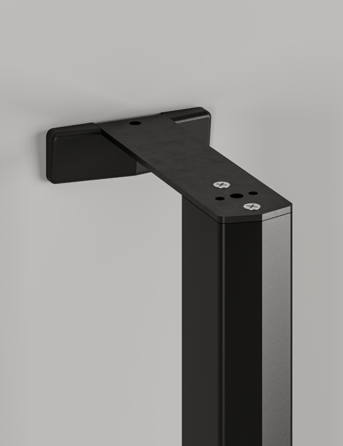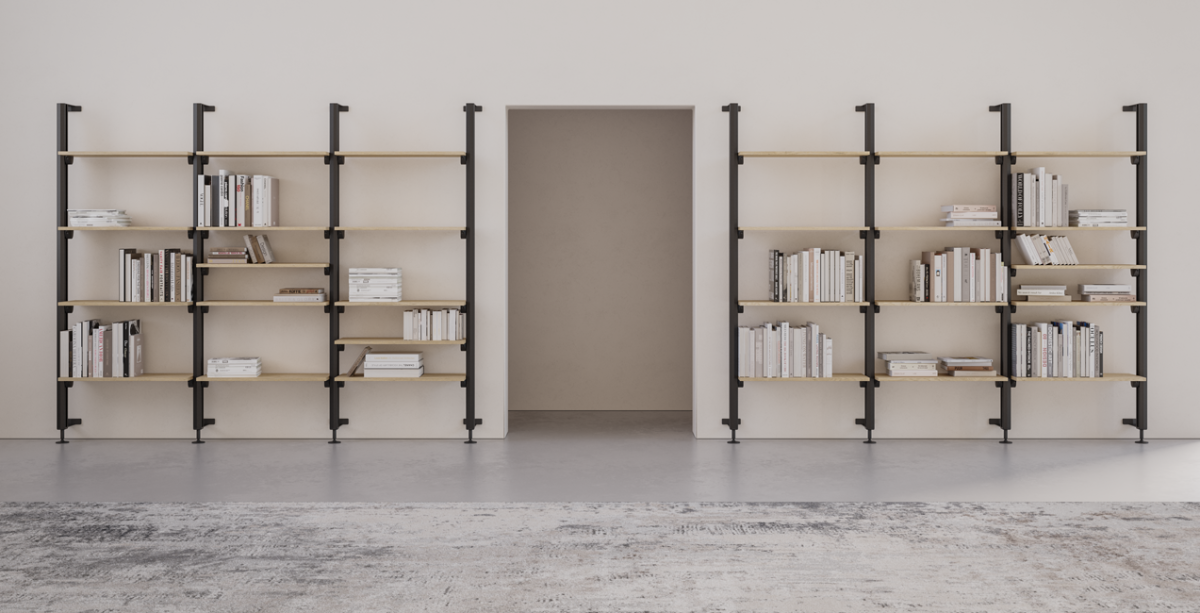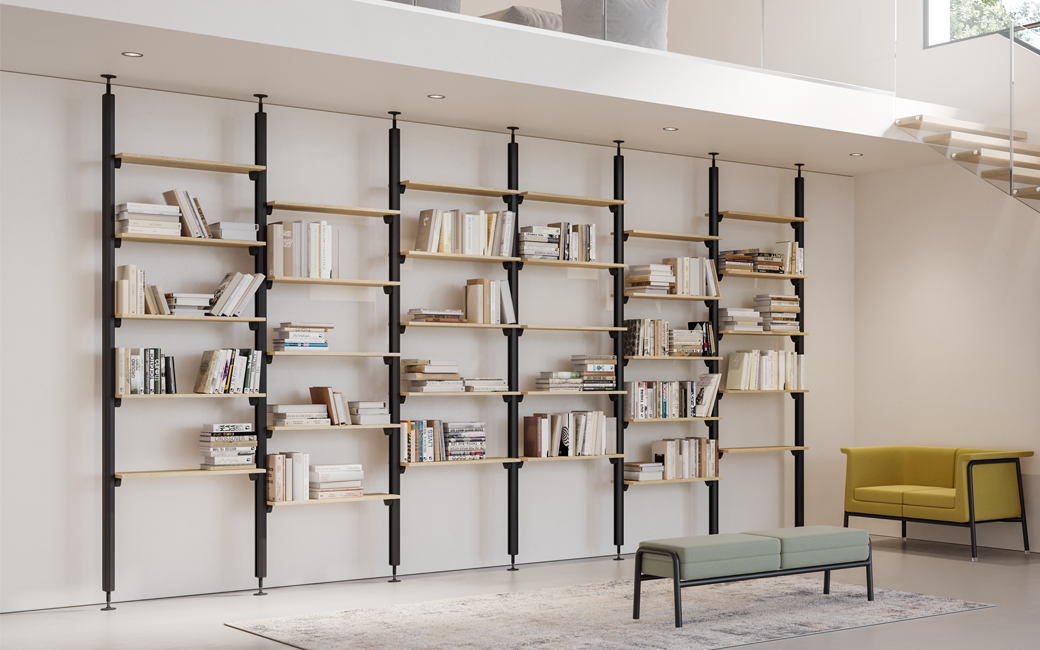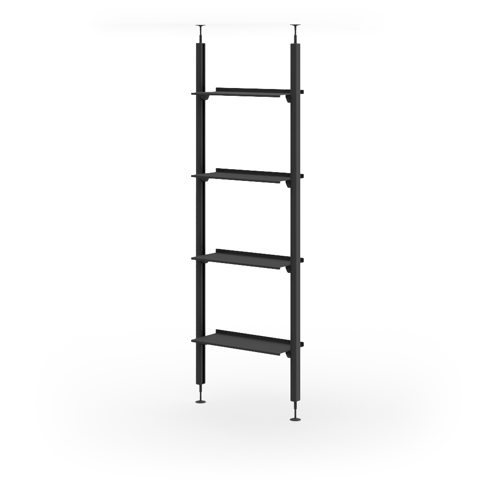 Nella versione per fissaggio a soffitto, Modula è proposta con un montante regolabile in altezza grazie all’utilizzo di appositi piedini, disponibili in 3 diverse lunghezze. La modularità garantita dall’utilizzo di montanti di testa e montanti centrali, permette a Modula di essere configurata in modo versatile e dinamico. I supporti mensola, sviluppati da Alba, possono essere posizionati liberamente lungo i montanti per garantire totale libertà nella disposizione e inclinazione delle mensole, facili da installare o rimuovere. Modula propone due classiche colorazioni per montanti, piedini, supporti mensola e mensole: bianco e nero.