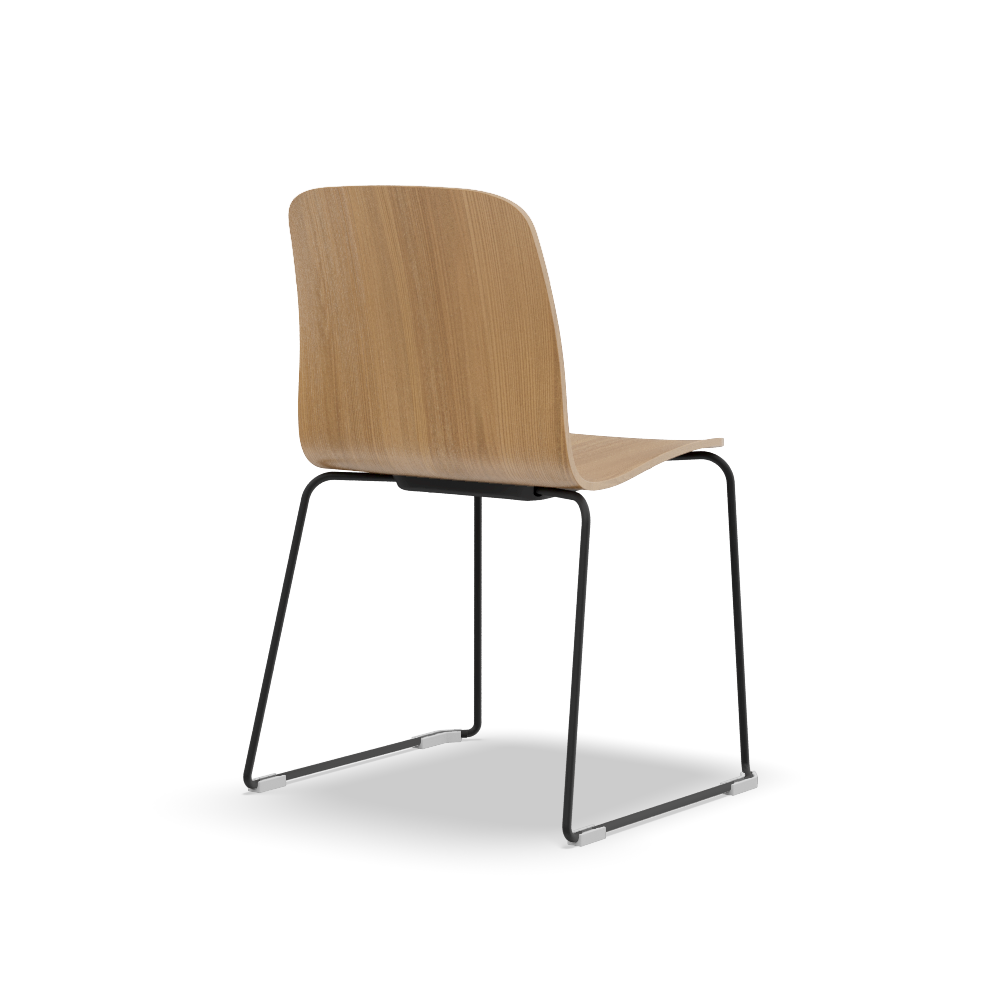 Una monoscocca in legno di faggio o rovere poggiata su una larga varietà di telai in metallo, dal classico 4 gambe, con o senza braccioli, al pratico telaio a slitta, fino alla versatile base a trespolo fissa su ruote. La cura del dettaglio della collezione passa dalla lavorazione della monoscocca in legno, anche tappezzabile, alle eleganti e funzionali cover sottoscocca in tecnopolimero, fino ai piedini orientabili disponibili per il telaio a 4 gambe. I telai sono proposti nelle finiture nera, avorio e cromata, mentre la cover sottoscocca è disponibile in nero o avorio.