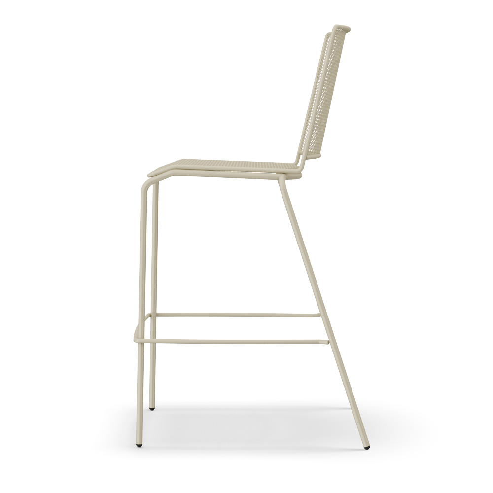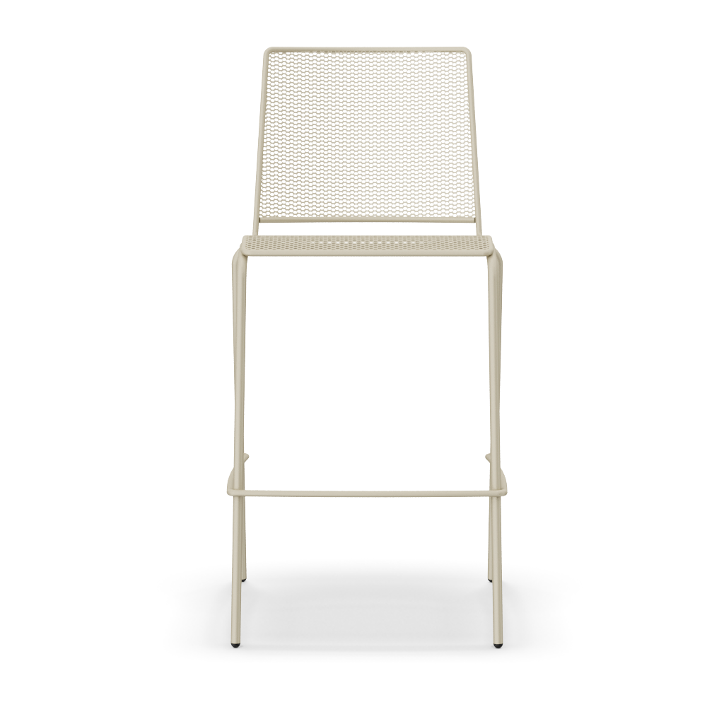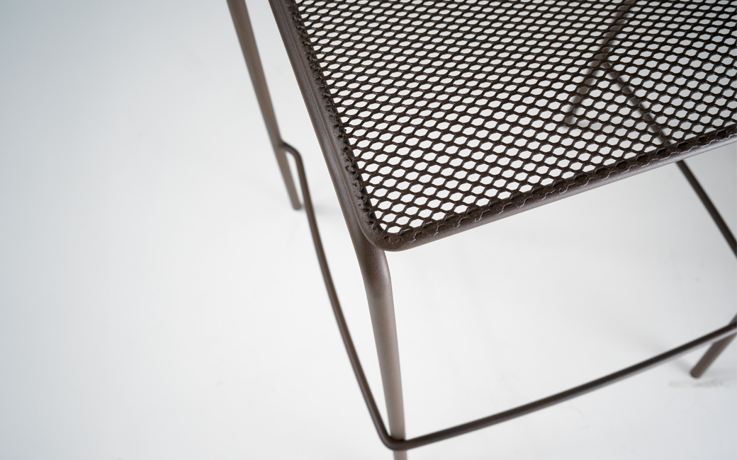 La linea di sedute completamente in metallo della collezione Tapas. Questo sgabello è l’ideale per un impiego outdoor, grazie alla solida struttura a 4 gambe con poggiapiedi integrato, caratterizzata da una particolare trama metallica ad effetto rete realizzata sullo schienale e sul sedile. Tapas è disponibile in color avorio e nella durabile finitura corten.