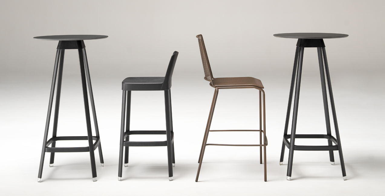 I tavoli assemblabili della collezione Tapas sono una soluzione pratica e versatile per l’arredo contract e living, sia interno che esterno. La versione media, disponibile con piani tondi o quadrati in HPL, è particolarmente indicata per food court, bar e contesti Ho.Re.Ca., specialmente se combinata con le sedie della stessa collezione. Le gambe dei tavoli sono disponibili nei colori nero, avorio e grigio, con finiture in corten o cromate, mentre i piani e il poggiapiedi sono disponibili in nero o avorio. Le possibilità di personalizzazione si completano con i piedini in policarbonato in finitura nera o trasparente.